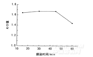 圖2 媒染時(shí)間與織物得色量K/S值的關(guān)系