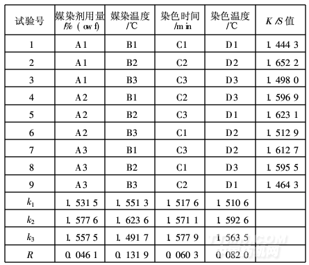 由表4中的極差分析可知,影響染色織物表觀顏色深度K/S值的順序依次為媒染溫度(B)>染色溫度(D)>染色時(shí)間(C)>媒染劑用量(A);其優(yōu)化組合為: