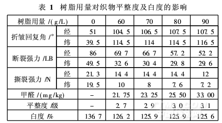 樹脂整理的目的是,在盡量減少色變和降低強(qiáng)力的前提下,提高織物的抗皺性??椢锏臉渲磉^程是纖維素與整理劑之間的交聯(lián)反應(yīng),因此,整理液中的樹脂用量對(duì)抗皺效果起決定作用。試驗(yàn)采用4種不同用量的樹脂整理液(用醋酸調(diào)節(jié)pH值至4, 155℃焙烘3. 5 min)對(duì)織物進(jìn)行整理,并測(cè)定織物整理后的性能,結(jié)果見表1。