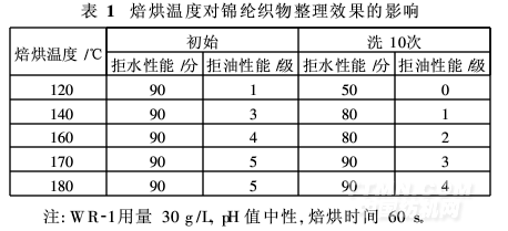 焙烘溫度對WR-1在織物上的成膜性有較大影響,進(jìn)而影響織物的拒水拒油效果。改變焙烘溫度,按
