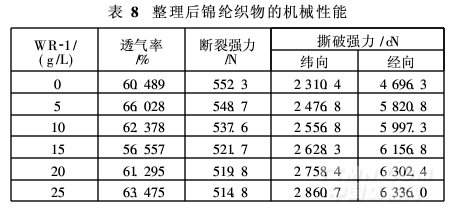 按優(yōu)化工藝,以不同用量整理劑WR-1整理錦綸,整理織物的各項性能見表8。