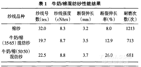本實(shí)驗(yàn)使用的棉紗、牛奶/棉混紡紗均來自上海正家牛奶絲科技有限公司,其中含有牛奶蛋白纖維和長絨 棉的比列為35:65和50:50。紗線性能測(cè)試使用YG026A 電子強(qiáng)力機(jī),選用200mm夾持距離,45ram/rain的拉伸速 度,預(yù)加張力15g,共測(cè)試100組數(shù)據(jù),取平均值。耐磨儀 采用LFY一109A多功能紗線耐磨性能測(cè)試儀,測(cè)試試樣 數(shù)20根,取平均耐磨次數(shù)。各項(xiàng)性能如下表1所示。