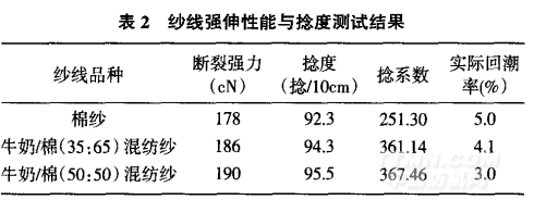 從表2可以看出,牛奶/棉混紡紗的斷裂強(qiáng)力隨著牛奶纖維含量的增加而變大,主要原因是牛奶纖維的斷裂強(qiáng)力高于棉紗;從捻度和捻系數(shù)測(cè)試結(jié)果可以看出差別不大。
