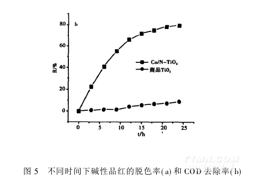 (5)用所制備的Co/N-TiO2作為光催化劑,在可見(jiàn)光的照射下光催化降解堿性品紅6 h后,堿性品紅可完全脫色,24 h后COD去除率可達(dá)79.4 %。