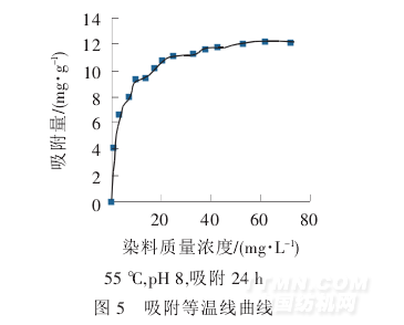 由圖4 可以看出,在最初的4 h 內(nèi),吸附速度比較快,雜化膜對直接桃紅12B 的吸附量隨時間的延長而增加.4.5 h 后,隨時間的延長,吸附變慢,吸附量的增加趨勢趨于平緩.因此,雜化膜對直接桃紅12B 吸附時間以4.5 h 為宜.