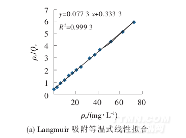 從圖5 可知,吸附量隨染料質(zhì)量濃度的增大而增大,60 mg/L 時,吸附基本達(dá)到平衡.將所獲得的吸附數(shù)據(jù)分別用Langmuir 等溫式和Freundlich 等溫式[12]線性擬合(Qe、ρe分別為達(dá)到平衡時雜化膜上的吸附量及溶液中直接桃紅2B 的質(zhì)量濃度),見圖6(a)、(b).