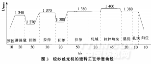 圖3是絲光機(jī)的運(yùn)轉(zhuǎn)工藝曲 線。 一個(gè)絲光程序總用時(shí)約為6 min(包括上下紗)。技術(shù)參數(shù)如下: 液堿濃度:260 g/I : 液堿溫度:(23±2)cc.需配備 足夠制冷量的液相交換冷凍機(jī)以 保證整個(gè)生產(chǎn)過(guò)程堿液溫度穩(wěn)定: 液堿滲透性:≤5 s(工業(yè)帆布 在堿液中的沉降時(shí)間).這項(xiàng)指標(biāo)對(duì)確保絲光紗的絲光鋇值均勻一致非常重要:
