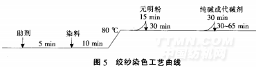絞紗染色的前處理工藝無(wú)其他特殊要求.只是經(jīng)絲光后濕態(tài)絞紗含較多堿液(NaOH濃度約為20~40 g/L).故前處理處方中基本不需加堿即可進(jìn)行練漂加工 絞紗染色工藝曲線如圖5所示。染料選擇:因色織針織布還需進(jìn)行坯布絲光加工.故通常會(huì)選用雙一氯均三嗪結(jié)構(gòu).即耐堿性較優(yōu)秀的高溫型活性染料染色.如德司達(dá)H—E型、科萊恩X型和國(guó)產(chǎn)品牌KE型等。