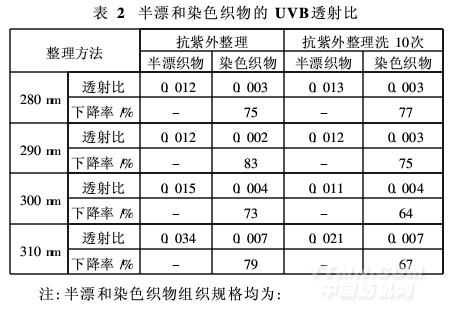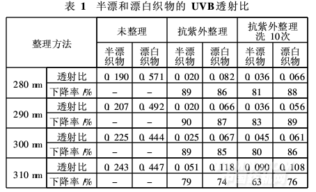 半漂和染色織物經(jīng)抗紫外整理后,透射比如表所示。