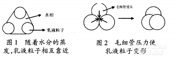 互相接近的乳液粒子之間產(chǎn)生毛細(xì)管現(xiàn)象,出現(xiàn)毛細(xì)管壓強(qiáng),促使毛細(xì)管變細(xì);毛細(xì)管越細(xì),壓強(qiáng)越大,當(dāng)毛細(xì)管壓強(qiáng)大于乳液粒子的抗變型力的時(shí)候,乳液粒子就發(fā)生變形,如圖2。