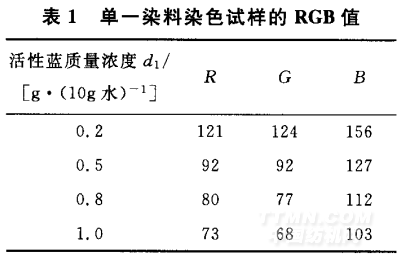 表1單一染料染色試樣的RGB值對(duì)所獲取的實(shí)驗(yàn)數(shù)據(jù)進(jìn)行分析,可知R值主要受活性藍(lán)的