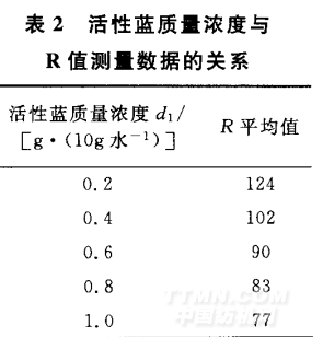 利用表2中的數(shù)據(jù),在Matlab中進(jìn)行曲線擬合 ,可得活性藍(lán)濃度與R值測量數(shù)據(jù)(平均值)之間的關(guān)系,見圖1所示。