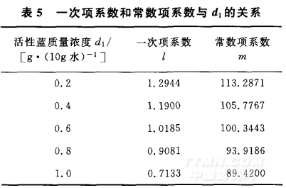 根據(jù)最小誤差平均值法和已知數(shù)據(jù),可求得一次項系數(shù)l和常數(shù)項系數(shù)m與活性藍(lán)染料質(zhì)量濃度d1的關(guān)系,如表5所示。
