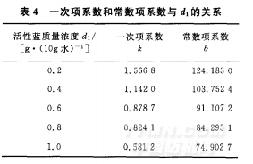 根據(jù)最小誤差平均值法和已知數(shù)據(jù),可求得一次項系數(shù)k值和常數(shù)項系數(shù)b值與活性藍(lán)染料質(zhì)量濃度d1 的關(guān)系,如表4所示。