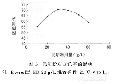 活性染料冷軋堆染色中,加入中性電解質(zhì)可起到促染作用。元明粉用量對固色率的影響見圖3。