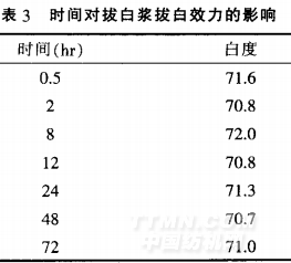 由表3可知.72h內(nèi).拔白漿的拔白效力基本不受時間影響.白度值穩(wěn)定在71±1之間。表明為中性.拔白漿的拔白效力的穩(wěn)定性很高