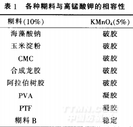 由表1可知.除糊料B與高錳酸鉀相容外.其它糊料與高錳酸鉀均不相容這是因為高錳酸鉀的強氧化性.導(dǎo)致多糖類及其衍生物和含羥基或—H的聚合物糊料發(fā)生氧化降解或交聯(lián)反應(yīng).破壞了膠體的穩(wěn)定性
