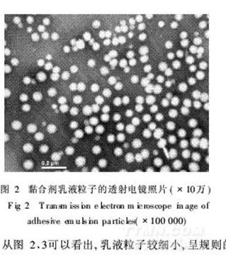 黏合劑乳液粒子在透射電子顯微鏡(TEM)下放大10萬倍,其形態(tài)結(jié)構(gòu)如圖2所示,粒子的粒徑分布見圖3。