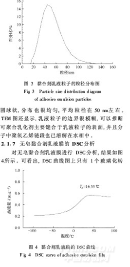 變區(qū)間,Tg為16·55℃,已知均聚物PBA、PMMA、PSt的Tg分別為-57、105、100℃,而在DSC曲線均無此種轉(zhuǎn)變,可說明各反應(yīng)單體及馬來酸酐脂肪醇聚氧乙烯醚單酯化物共聚良好,不存在相應(yīng)的均聚物。