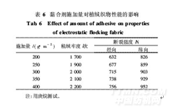 黏合劑的主要作用是連接絨毛和底布,其施加量直接影響植絨織物的植絨牢度、斷裂強(qiáng)度、透氣性和手感等。在焙烘溫度為155℃,焙烘時(shí)間為5min的條件下,研究黏合劑施加量對植絨織物植絨牢度和斷裂強(qiáng)度的影響,結(jié)果如表6所示。