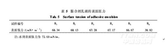 在無皂黏合劑乳液聚合體系中,可聚合乳化劑與主要反應(yīng)單體進(jìn)行共聚。如果可聚合乳化劑已完全共聚到聚合物上,則聚合物乳液的水相中不含游離的可聚合乳化劑,聚合物乳液水溶液的表面張力應(yīng)接近水的表面張力。故可通過測定乳液水溶液的表面張力[10-11]來定性地判斷可聚合乳化劑參與聚合的程度。由可聚合乳化劑制備的黏合劑乳液的表面張力測試結(jié)果如表5所示。從表5可見,由可聚合乳化劑所制備的黏合劑乳液的表面張力與純水相近(66·67~68·34mN/m),但比可聚合乳化劑水溶液在濃度于CMC值以上的表面張力(40·54mN/m)要高許多,說明只有很低濃度的可聚合乳化劑存在于水相中。而由傳統(tǒng)乳化劑SDS和TX-30制得的乳液其表面張力(38·82mN/m)與水溶液的表面張力(33·46mN/m)非常接近,說明SDS和TX-30以物理方式吸附在乳液粒子表面。