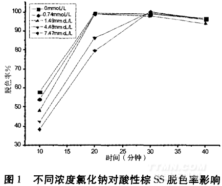 圖1表明氯化鈉濃度低時(shí),氯化鈉對(duì)酸性棕ss的影響不大,當(dāng)溶液中氯化鈉的濃度較大時(shí),有明顯的抑制作用。但當(dāng)反應(yīng)到30分鐘以后,染料脫色率都達(dá)到95%以上。