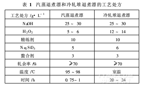 天絲纖維濕處理時(shí)具有異向溶脹性,極易產(chǎn)生原纖化和繩狀折皺印。退煮漂采用一步法工藝,可克服機(jī)臺(tái)多、效率低、易產(chǎn)生皺條、擦傷和緯斜等疵病。我們對冷軋堆退煮漂一步法工藝與汽蒸退煮漂一步法工藝進(jìn)行了比較。