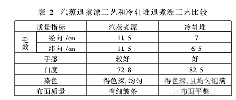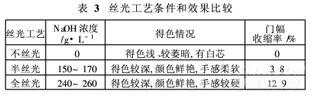 從表3可以看出,半絲光工藝和全絲光工藝得色均較深,且顏色鮮艷,但后者手感較硬,門幅收縮大,擴(kuò)幅十分困難,因此我們采用半絲光工藝。