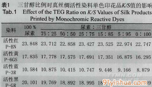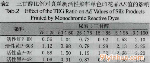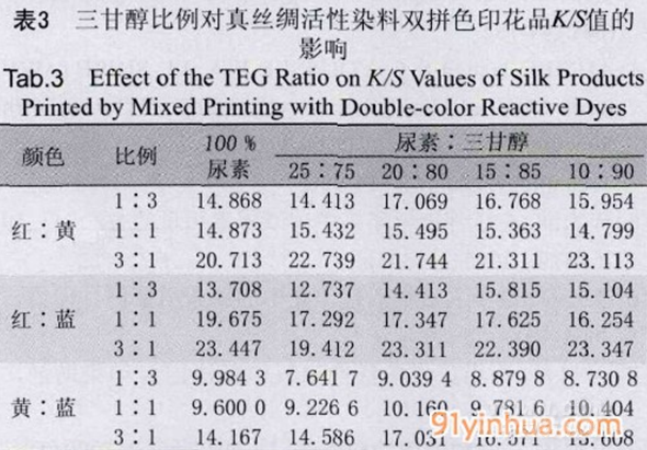 取尿素與三甘醇的混拼比例分別為25:75、20:80、15:85,和10:90,調(diào)制色漿后對(duì)真絲綢進(jìn)行活性染料印花,印花后測(cè)得的K/S值與△E值 如表351表4所示。