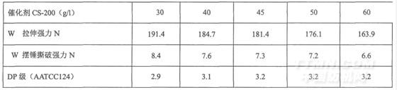 由上表可知,增加催化劑用量,DP級逐漸提高,但是強力也明顯下降,當催化劑用量是樹脂用量的30%左右時(即上表40~50g/l),綜合DP級與強力最好。