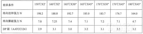 由上表數(shù)據(jù)可知,在溫度160℃-170℃,焙烘時間45秒時,可達到較好的平服度,再提高溫度,平服度增加不明顯,強力損失較大。最佳的溫度與時間為165~170℃45秒。