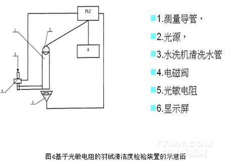 基于光敏電阻的羽絨清潔度檢驗裝置,主要應用于羽絨加工清洗過程中清潔度的快速檢驗,屬羽絨加工技術領域。該裝置包括測量導管、水洗機清洗水管,在水洗機清洗水管下面有電磁閥,電磁閥的一端與測量導管連接,測量導管上方有光源,測量導管的底部有光敏電阻,電磁閥的另一端與PLC相連接,PLC連接有顯示屏,通過光敏電阻實時檢驗羽絨清潔度,將測得的電壓值和知識庫中參數(shù)比較來得到當前的羽絨清潔度。基于光敏電阻的羽絨清潔度檢驗裝置的示意圖見圖4.