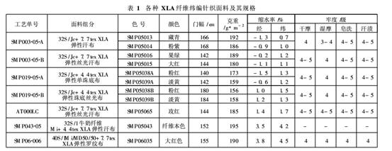 根據(jù)XLA纖維的性能,我們重點開發(fā)了耐堿、熱絲光的“高級彈性絲光針織面料”和不耐高溫、預定形的“牛奶纖維彈性針織面料”,大批生產了7個品種,共11種顏色,出口到法國、瑞士等國家和地區(qū)(見表1)。