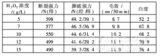 由表1知,隨著H2O2用量增大,織物的斷裂強(qiáng)力急劇下降, H2O2用量超過10g/L,斷裂強(qiáng)力較低,不宜采用。綜合各指標(biāo),選擇H2O2用量為7~8g/L。