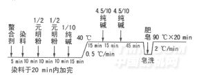 適合該面料的染料為活性染料。選用中溫型棉用活性染料,用氣流染色機染色。