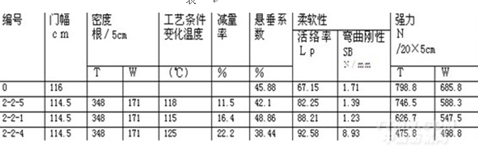 試驗的減量率、懸垂系數(shù)、活絡率、彎曲剛性強力等數(shù)據(jù)見(表一)。