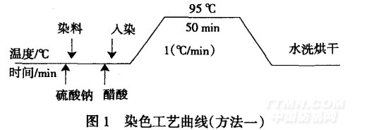 工藝配方為:(蘭納素紅2B)=2%,(元明粉)=15%,用醋酸調(diào)pH值至4,浴比(質(zhì)量比)為1:50。