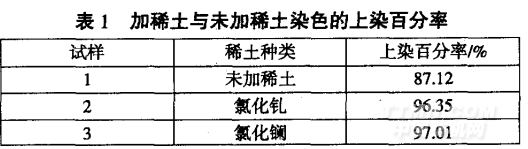 (1)分別改變稀土種類和稀土的用量,觀察其對染色性能的影響。按上面所述工藝進(jìn)行染色實驗,在染色進(jìn)行到一半時分別加入氯化釓和氯化鑭稀土溶液,實驗對比兩種稀土的上染百分率。加稀土和未用稀土染色的上染百分率對比如表1所示。