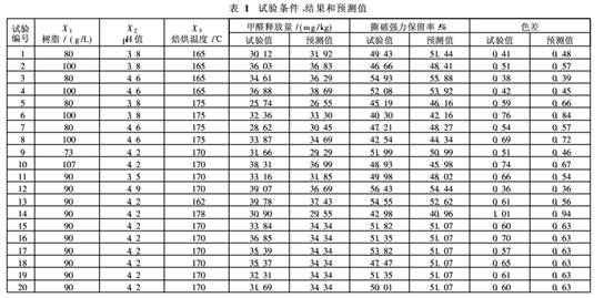 用中心旋轉(zhuǎn)法設(shè)計了樹脂用量、整理液pH值和焙烘溫度等三個變量、五個水平的20個試驗[2],試樣的釋放甲醛量、緯向撕破強(qiáng)力保留率及色差的試驗值和經(jīng)中心旋轉(zhuǎn)法二次回歸[3]分析后的預(yù)測值見表1。