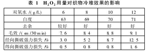 由表1可知,隨雙氧水用量的增加,織物白度提高,但經(jīng)向強(qiáng)力下降較多;當(dāng)雙氧水質(zhì)量濃度為12 g/L時,織物經(jīng)向強(qiáng)力損傷嚴(yán)重,而去雜效果和毛效并不隨雙氧水用量的提高而顯著增加??紤]到實際生產(chǎn)中織物上的雜質(zhì)可能導(dǎo)致雙氧水無效分解,應(yīng)適當(dāng)增加雙氧水的用量。對已經(jīng)過酶退漿處理的織物,可減輕冷堆氧漂的壓力,雙氧水質(zhì)量濃度為8~10 g/L。