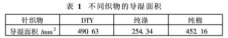 將6 cm×6 cm試樣室溫放置24 h后,置于燒杯口部,匝緊;試樣表面必須平整,且經(jīng)緯紗無扭曲。用滴定管距試樣表面1 cm處滴一滴水,測量水滴接觸織物后滲透擴(kuò)散的速率,并測量1 min后試樣的導(dǎo)濕面積。滲透擴(kuò)散速率越快,說明織物的滲透性和擴(kuò)散性越好;導(dǎo)濕面積越大,說明織物的吸水性越好。分別對毛坯緯編織物(Ⅰ),以及還原清洗(Ⅱ)、吸濕排汗整理(Ⅲ)、拉幅定形(Ⅳ)進(jìn)行取樣測試,發(fā)現(xiàn)試樣滲透速率由大到小的順序?yàn)棰?Ⅲ=Ⅳ>Ⅱ。除Ⅱ?qū)衩娣e較小(200. 96 mm2)外,Ⅲ、Ⅳ、Ⅰ導(dǎo)濕面積相差不大(490. 63 mm2)。將每平米干重相近的耐久型DTY針織物(A)、純滌針織物(B)和純棉針織物(C)同時(shí)做擴(kuò)散性能測試,發(fā)現(xiàn)滲透速率順序?yàn)锳>C>B。導(dǎo)濕面積如表1。