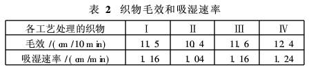 采用毛吸高度的測試進(jìn)行對比測試,操作如下:將Ⅰ、Ⅱ、Ⅲ、Ⅳ樣布,沿經(jīng)、緯向分別裁取30 cm×2. 5 cm的試樣,室溫放置24 h后,用不銹鋼小夾子將各試樣兩頭(窄邊)平行固定在兩根玻璃棒上,其中一根固定在水槽兩側(cè)的支架上,另一根浸沒于水中,水溫為25~27℃。10 min后測定毛效,取經(jīng)緯向平均值,計(jì)算吸濕速率(見表2)。