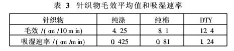 由表2知,采用染色和吸濕排汗同浴整理的織物,經(jīng)還原清洗后,其毛效較毛坯差,說明還原清洗對織物的吸濕排汗性能有一定的影響,這與其擴(kuò)散性能的測試一致。成品毛效的平均值為12. 4 cm,吸濕速率則為1. 24 cm/min,符合日本JISK0050檢測標(biāo)準(zhǔn)(該標(biāo)準(zhǔn)要求毛效10 cm為合格, 12 cm為良好)。將DTY針織物、純滌針織物和純棉針織物進(jìn)行毛