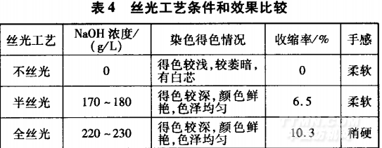 由表4看出,經(jīng)半絲光和全絲光工藝處理后,染色織物的得色均較深,且顏色鮮艷,色澤均勻;但經(jīng)全絲光工藝處理織物手感稍硬,門幅收縮大,擴(kuò)幅困難。因此,宜采用半絲光工藝,絲光堿濃度為170一180g/L.