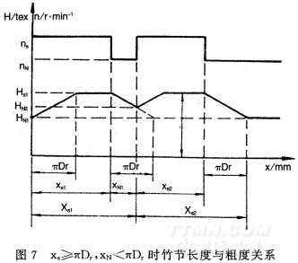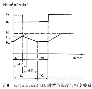 設(shè)置組合,紡出的竹節(jié)粗細(xì)長(zhǎng)度為不對(duì)稱(chēng)形,竹節(jié)設(shè)置長(zhǎng)度越短這種不對(duì)稱(chēng)性越大。如果竹節(jié)長(zhǎng)度設(shè)置盡量短(xs→零),而竹節(jié)粗度設(shè)置得足夠大(能產(chǎn)生明顯竹節(jié))的話,在理論上可獲得的最短竹節(jié)長(zhǎng)度為一個(gè)轉(zhuǎn)杯周長(zhǎng)長(zhǎng)度。但是由于伺服升速特性和伺服傳動(dòng)系統(tǒng)承受極短暫高速變速慣性沖擊能力的限制以及伺服降速延遲長(zhǎng)度的影響。實(shí)際轉(zhuǎn)杯紡所獲得的最短竹節(jié)長(zhǎng)度要大于轉(zhuǎn)杯周長(zhǎng)。