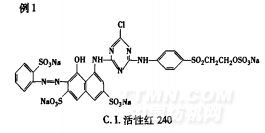 UO值=3320/720=4.61,兩者UO值差1.07染料分子質(zhì)量越小,乙烯砜取代硫酸酯后,元機性值下降所占比例越大,UO值相應(yīng)下降越多。由例2和例3說明,含有硫酸酯乙基砜的ME型,EF型和KN型活性染料,在加堿固著時硫酸酯被消除,而轉(zhuǎn)化為乙烯砜時,UO值驟減,疏水性增加而造成瞬時吸附增大,常常會造成染色不勻現(xiàn)象。對于UO值較小的活性染料,硫酸酯轉(zhuǎn)化為乙烯砜過程中UO值降低,將造成染色更加不勻¨“,所以要選用UO值較大的染料。