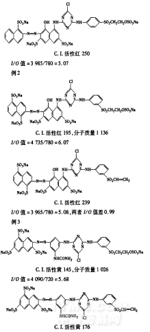 染料的上染可以看作染料在染浴(親水相)和纖維(疏水相)兩相問的分配,所以活性染料的親水性和疏水性會影響它對纖維的吸附。重氮組分中的萘環(huán)取代苯環(huán)后,疏水性增加,UO下降;尤其是活性基以乙烯砜基代替硫酸酯乙基砜后,少了一個親水基團硫酸酯,UO相應(yīng)下降。以三組染料為例,說明實際應(yīng)用時如何計算活性染料UO值。