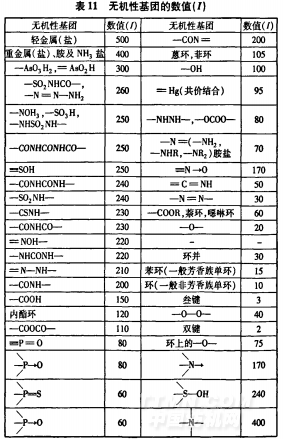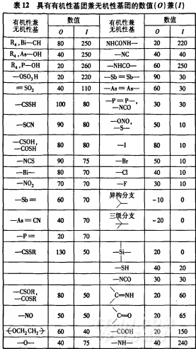 與有機性值相比,無機性值的確定就比較復(fù)雜。把醇類羥基的無機性值定為100,并以此為基礎(chǔ),決定其它取代部分的數(shù)值。具體無機性值的數(shù)值列于表11,而有些基團有有機性值也有無機性值,其數(shù)值列于表12。