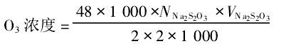 在500 mL洗氣瓶中,加入20%KI溶液10 mL,以蒸餾水稀釋到250 mL,通入2 L O3,在溶液中加5 mL3 mol/LH2SO4酸化,以0. 1 mol/L Na2S2O3滴定至淡黃色,再加1mL淀粉指示劑至呈紫褐色,以0. 1mol/L