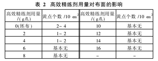 在直接漂白坯布時(shí)發(fā)現(xiàn),棉籽殼在膨化時(shí)會(huì)產(chǎn)生黃汁而沾污布面,烘干后會(huì)在布面上形成米粒大的黃點(diǎn)。為解決該問(wèn)題,首先考慮選用有效的化學(xué)助劑,如高效精練劑,可起到分散黃汁、防止沾污的作用,高效精練劑的用量對(duì)漂白后布面黃點(diǎn)個(gè)數(shù)的影響見表2。